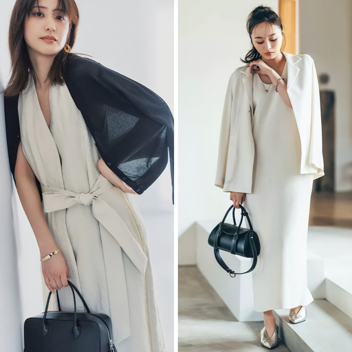 白色连衣裙自带清新魅力,搭配同色系西装,在商务场合能给人留下好印象。为避免白×白过于甜美,可搭配银色高跟鞋来平衡并收束整体造型。