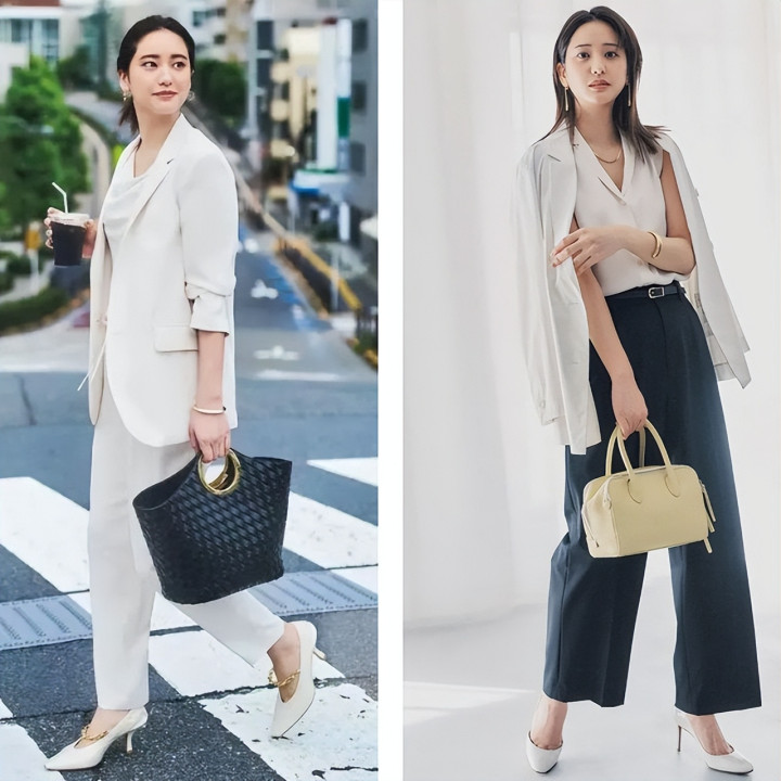 白色西装与裤子的套装,清爽有夏日感,适合初秋穿搭。搭配黑色包包可避免整体过于单白,保持造型的利落感。