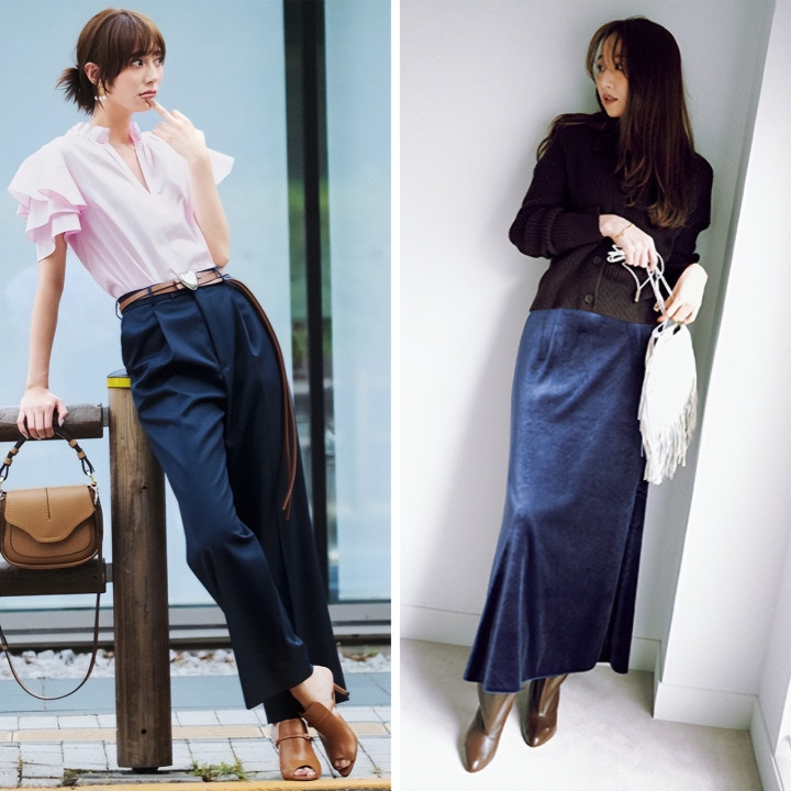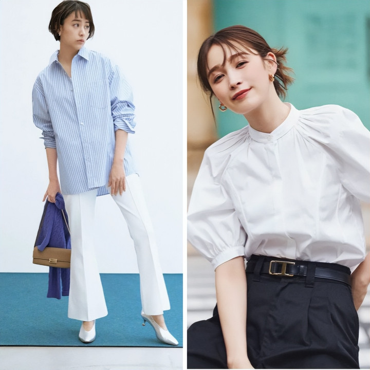 甜美宽袖衬衫,通过与黑色单品搭配,以单色风格呈现,可展现成熟感。利用金属扣腰带和大款耳环等小饰品,可为整体造型增添趣味。