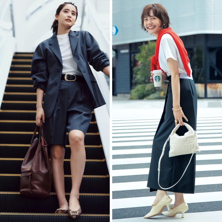 早秋时节,薄纱西装是质感场合的理想选择。透视感海军蓝款式,兼具轻盈与高雅。搭配白色直筒裙和帆布手提包,轻松应对高温。